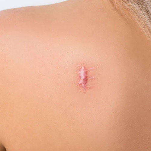 Keloids are raised overgrowths of scar tissue that form at the site of a skin injury, such as a cut, burn, or surgery.